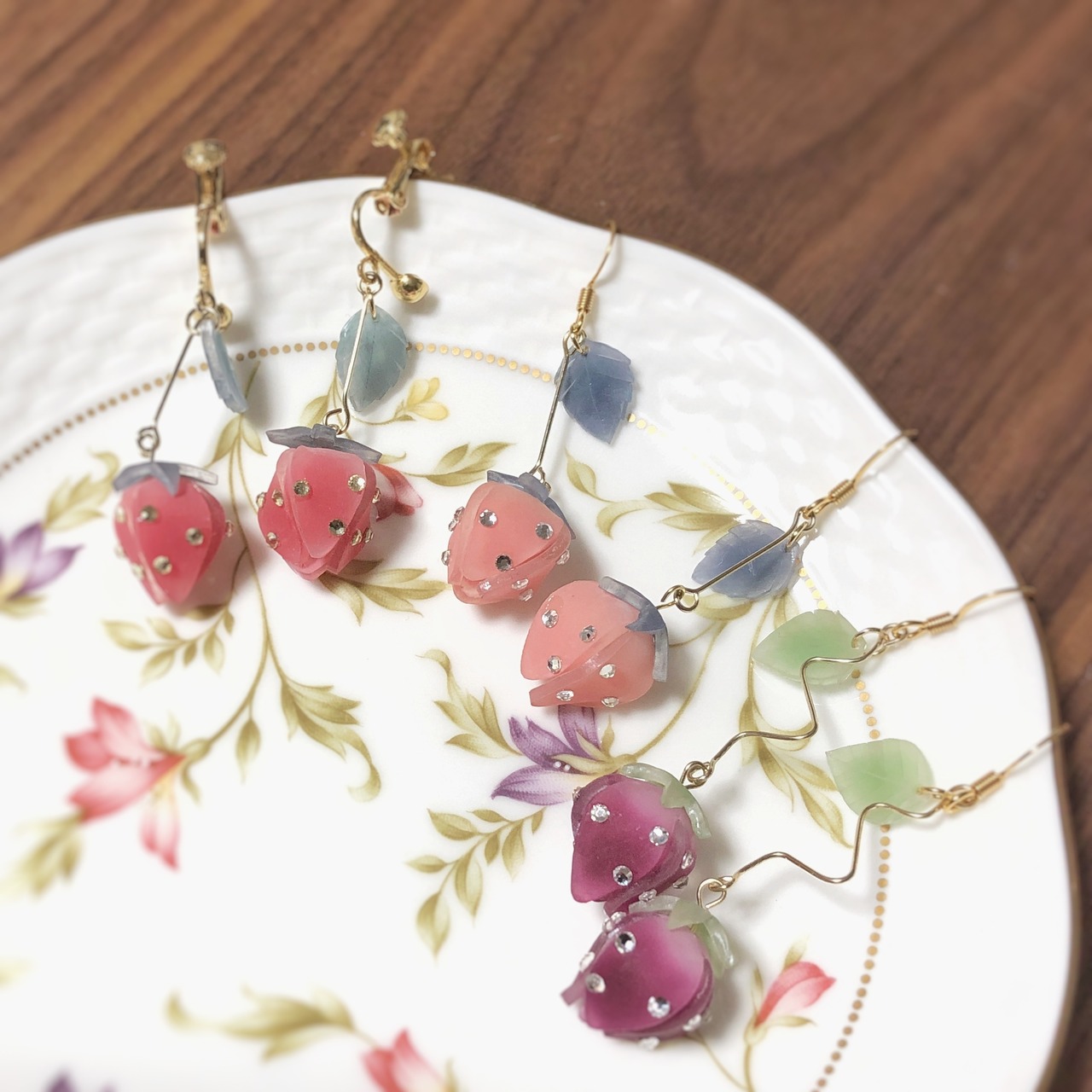 コロンとした立体感のある苺に、キラキラ輝くラインストーンを種をトッピングしました。ゆらゆらと耳元で苺が揺れます。