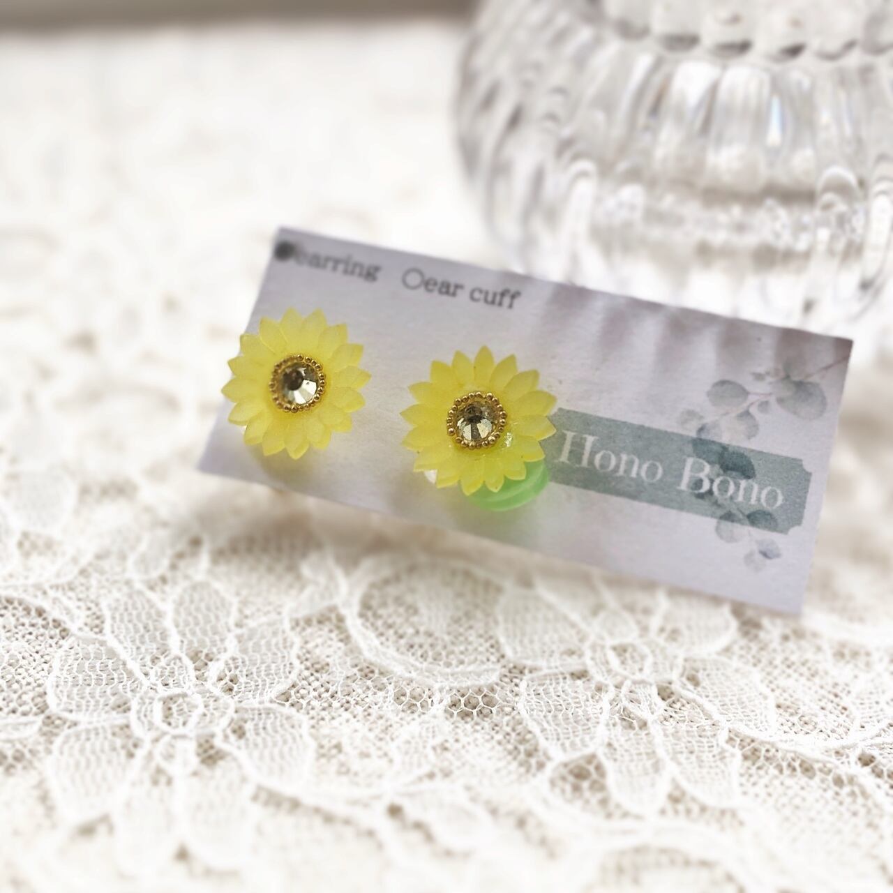 耳が小さめな小耳さんのために、人差し指サイズのミニ向日葵を耳飾りにしました。